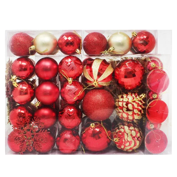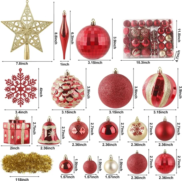 • Red and gold Christmas ball ornaments includes 8 Matte Balls, 8 Glittery Balls, 6 White Balls, 6 Shiny Balls, 6 Disco Balls, 6 Bells, 5 White Snowflakes, 5 Blue Snowflakes, 4 Geometric Balls, 4 Snowflake Balls, 4 Gift Boxes, 4 Snowflake Icicles, 2 Snowy Pinecones, 1 Swirls Balls, 1 Tinsel Garland, 1 Silver Star Tree Topper.