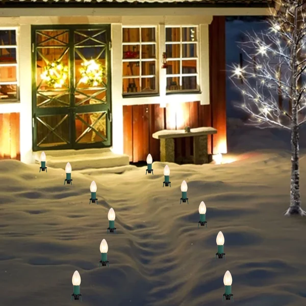 Our warm white Christmas pathway lights are the perfect addition to your outdoor decorations. Connectable strands to optimize the need for larger area lighting and festival decorations. These outdoor pathway lights will create a beautiful ambiance to Illuminate your indoor & outdoor, home, pathway, walkways, front yards, Christmas tree décor, and so on. These outdoor pathway lights come in a 15.75ft long strand with 12 C9 Warm White LED bulbs spaced 12″ inches apart on green wire. You can connect multiple strands end-to-end for longer reach or connect multiple light sets together in one location. With our C9 white warm string lights, you can add so much color to your home!
