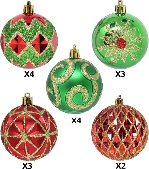 • Our Shatterproof Christmas Ornaments Set includes 4 Zigzag Balls, 4 Swirls Balls, 3 Snowflake Balls, 3 Geometric Balls, and 2 Spiral Balls in a combination of Red, Green, and Gold.