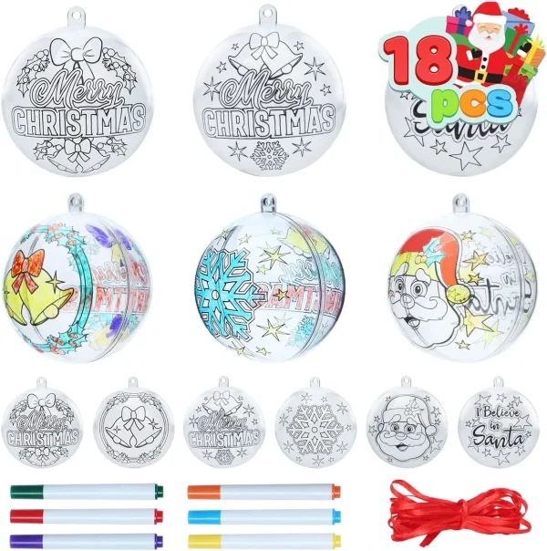 • Our Fantastic DIY Clear Plastic Christmas Ball Ornaments include 6 crayons,1 ribbon for 18 balls, and 18 pcs two-sided clear plastic Christmas ball ornaments in 3 different designs, including Santa Claus, Merry Christmas, snowflakes, bells, and other elements. Perfect for Christmas indoor and outdoor decorations!
