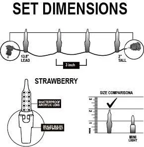 • LED Christmas mini light strings comes with 100 counts of multicolor strawberry-shaped led Christmas mini light strings, this string light has a length of 52.2 ft (15.9m). And come with Extra Bulbs & Replacement Fuses