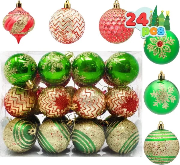 β’ Red green and gold Christmas balls include 12 green and gold glitter balls, and 12 red and gold glitter wavy balls. Each color is bright and beautiful and perfect for Christmas decorations!