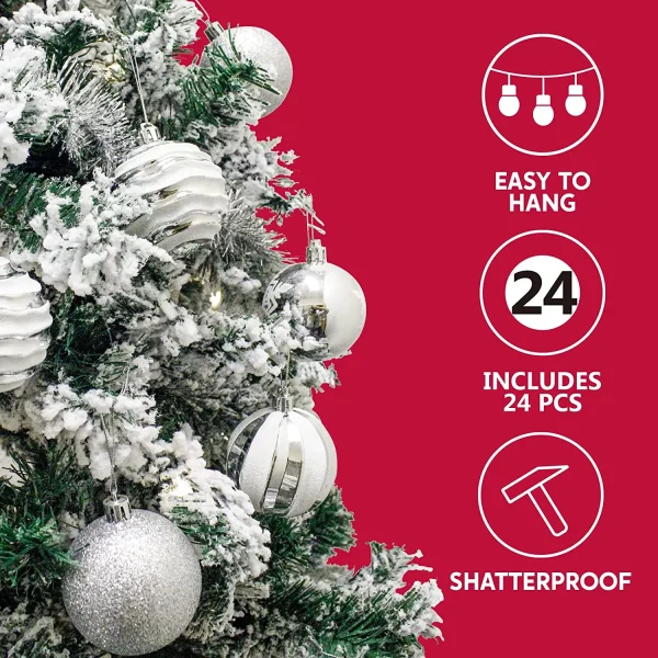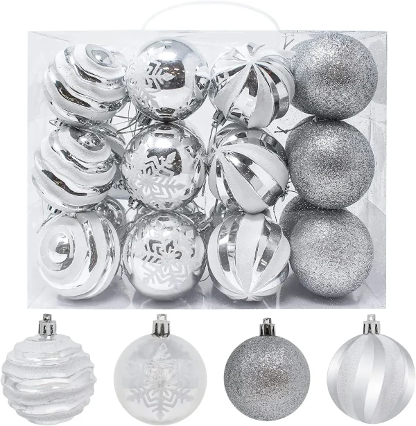 These lovely Christmas ornament balls are great decorations and fun to throw at each other during the holidays. A Christmas-themed party is a perfect place to use these glittery ornaments! This set of 12 shatterproof, silver, and white color Christmas balls includes 6 wavy stripes balls, 6 snowflake balls, 6 swirls balls, and 6 glitter balls featuring 24 shatterproof Christmas balls measuring 2.36 inches with silver glitter on the outside. These Christmas decoration balls are ideal for hanging on your home or office window or door and make a wonderful gift for anyone who loves the holiday season!