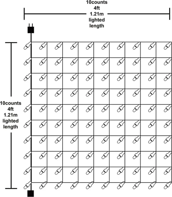 ⢠Incandescent net Christmas lights feature 100 bright Warm White mini incandescent bulbs with green wires, spare bulbs, and fuses. Each set has a light area of 4 x 4 Feet. High Voltage.