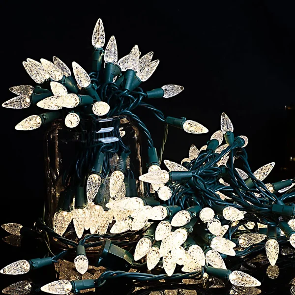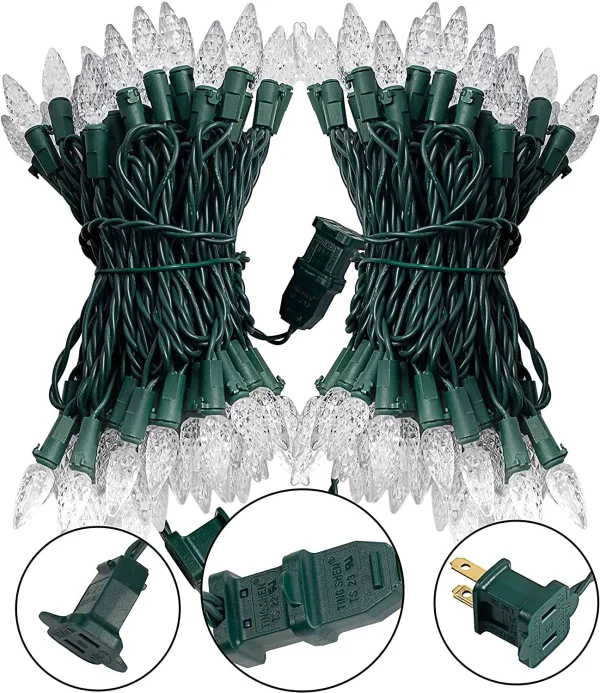 • C6 LED Christmas string lights include 2 packs of 70-count Warm LED light strings. Each set measures around 24.28 FT with Green wire. whole Lighted Length coverage of 22.47 FT. The total length is 48.56 FT. Also equipped with a C6 bulb (with 2 extra bulbs)type for more efficient, bright, and energy-saving lighting.