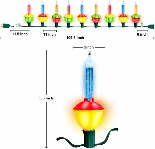 • Bubble light string Christmas tree includes 2 packs of 9-count Multicolor Christmas Bubble Incandescent String Lights measuring 8.8 ft long.