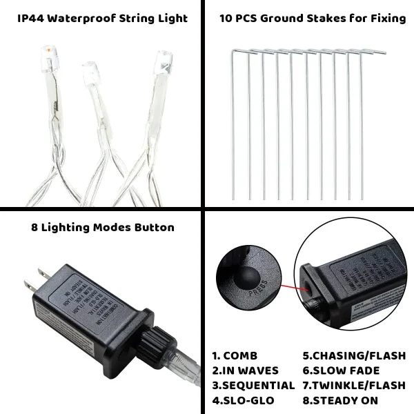 • The light comes with 8 flashing modes to create a unique atmosphere for fun. Lighting modes include flashing, twinkle, waves, sequential, slow-glow, chasing, slow fade and steady on.