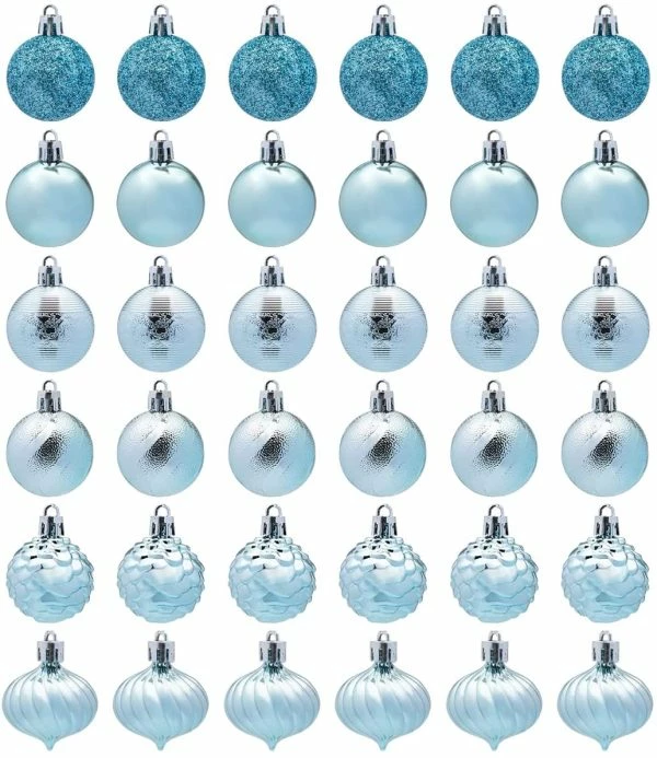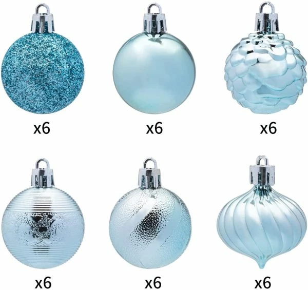 • Our Baby Blue Ornaments Set includes 6 glitter balls, 6 swirl balls, 6 swirls with bulge balls, 6 stripes Balls, 6 shiny balls, and 6 pinecone balls. The main colors are baby blue, teal, rose gold, gold, silver, and red. Each color is bright and beautiful and perfect for Christmas decorations!