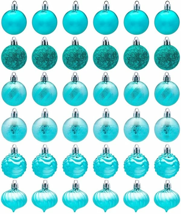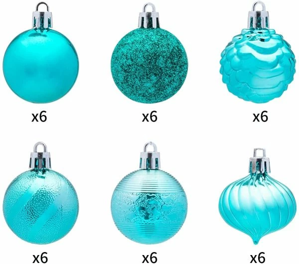 - Super value pack. Our Christmas ornament set includes 6 glitter balls, 6 swirl balls, 6 swirls with bulge balls, 6 stripes balls, 6 shiny balls, 6 pinecone balls. The main colors are baby blue, teal, rose gold, gold, silver, red. The Christmas balls are bright and beautiful and perfect for Christmas decorations!