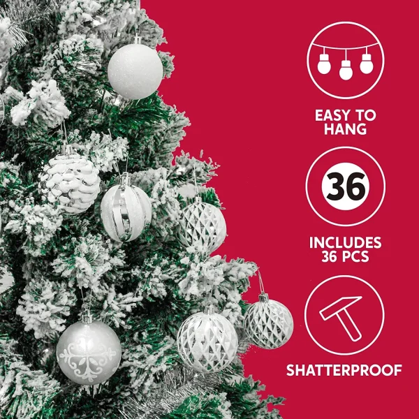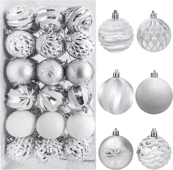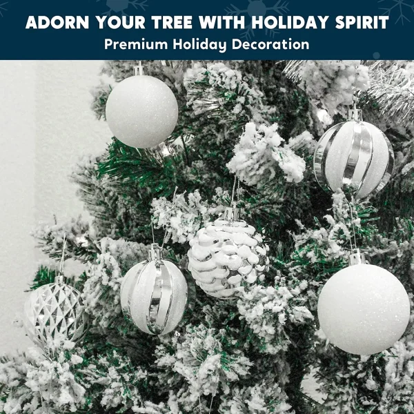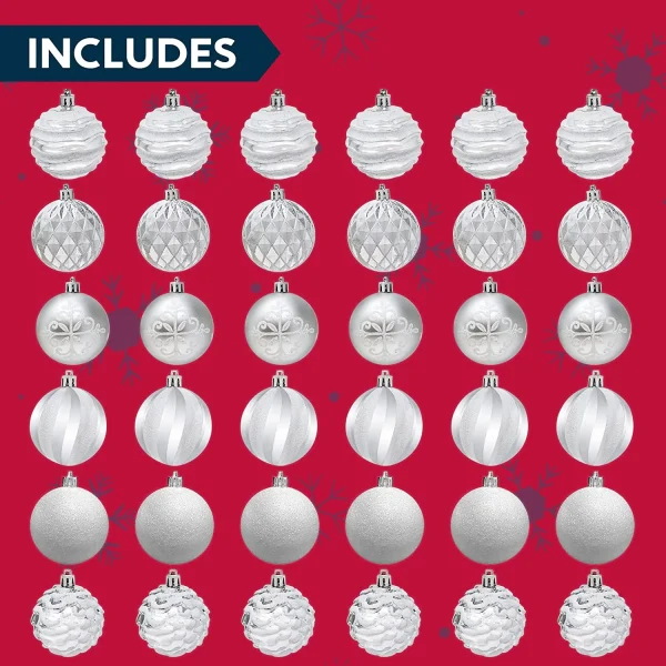 • White and silver Christmas balls include 6 Stripes Balls, 6 Plaid Balls, 6 Spirals Balls, 6 Swirls Balls, 6 Glitter Balls, and 6 Snowy Pinecone Balls.
