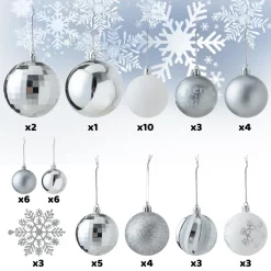 - Our fantastic Christmas decoration set includes 50 pcs assorted Christmas ball ornaments of 10 matte balls, 10 white balls, 7 shiny balls, 7 disco balls, 4 glitter balls, 3 swirl balls, 3 hexagram snowflake balls, 3 Christmas tree balls, 3 snowflakes. Perfect for indoor and outdoor decorations for this Christmas season. Measuring 1.57, 2.36, 3.15 inches.