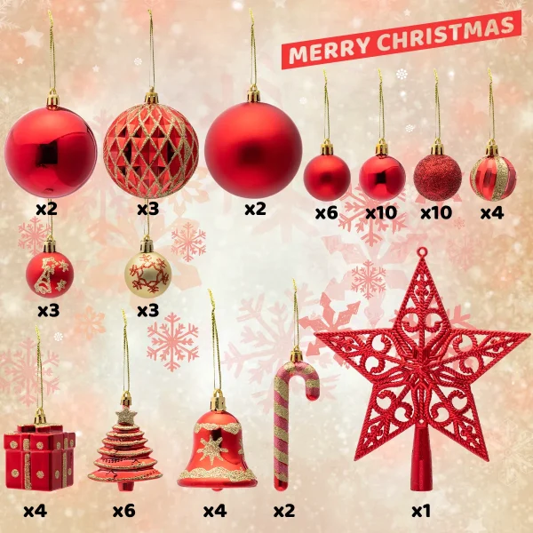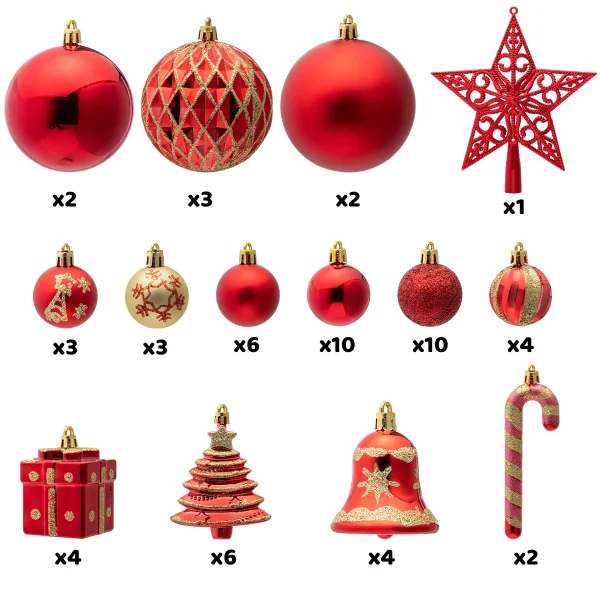 • Our christmas ornament assortment Set includes 12 Red Glitter Balls, 12 Red Shiny Balls, 6 Red Matte Balls, 6 Christmas Trees, 4 Swirls Balls, 4 Bells, 4 Gift Boxes, 3 Snowflake Balls, 3 Christmas Tree Balls, 3 White Snowflakes, 3 Red Snowflakes, 3 Diamond Plaid Balls, 2 Candy Canes, 1 Red Star Tree Topper.