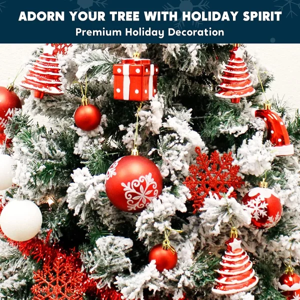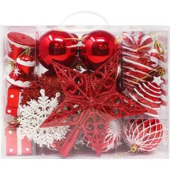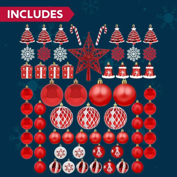 • Our Assorted Christmas Ornaments Set includes 12 Red Glitter Balls, 12 Red Shiny Balls, 6 Red Matte Balls, 6 Christmas Trees, 4 Swirls Balls, 4 Bells, 4 Gift Boxes, 3 Snowflake Balls, 3 Christmas Tree Balls, 3 White Snowflakes, 3 Red Snowflakes, 3 Diamond Plaid Balls, 2 Candy Canes, 1 Red Star Tree Topper.