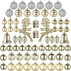 Our gold and silver Christmas ornaments set to include 19 Shiny Balls, 13 Matte Balls, 8 Glitter Balls, 6 Pine Cones, 5 Snowy Balls, 5 Swirls Pattern Balls, 4 Diamond Plaid Balls, 2 Gift Boxes, 2 Flying Reindeers, 2 Bells. This set of Christmas tree decorations is a great way to decorate your home for the holidays. The holiday ball ornaments come in a variety of different colors and shapes, ranging from traditional Christmas colors to more modern shades. From traditional balls to modern shapes and designs, you are sure to find the perfect ones for your home. Displaying these metallic gold and silver balls around your tree will add a touch of elegance to your holiday decorating!