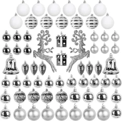 • Our Christmas Tree Ornaments White and Silver Set includes 19 Shiny Balls, 13 Matte Balls, 8 Glitter Balls, 6 Pine Cones, 5 Snowy Balls, 5 Swirls Pattern Balls, 4 Diamond Plaid Balls, 2 Gift Boxes, 2 Flying Reindeers, 2 Bells.