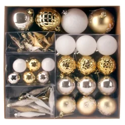 • Assorted size Christmas ball ornaments include 4 Silver Shiny Balls, 4 Golden Matte Balls with Merry Christmas, 12 White Matte Balls, 4 Golden Pinecone Balls, 4 White Matte Icicles, 4 Silver Glitter Icicles, 4 Golden Glitter Icicles,5 Silver Stars,5 Golden Stars,2 White Disco Balls,2 Silver Disco Balls,2 Golden Disco Balls,8 Golden Shiny Balls,7 White Shiny Balls. Each Color Is Bright And Beautiful And Perfect For Christmas Indoor And Outdoor Decorations!