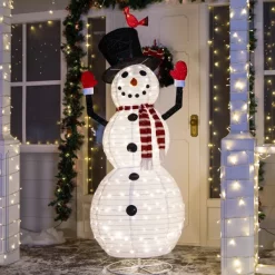 • This Collapsible Outdoor Snowman Includes a 6ft Collapsible Snowman with 240 LED Warm White Lights in Clear Wire and 4 Metal Stakes. The material is Tinsel.