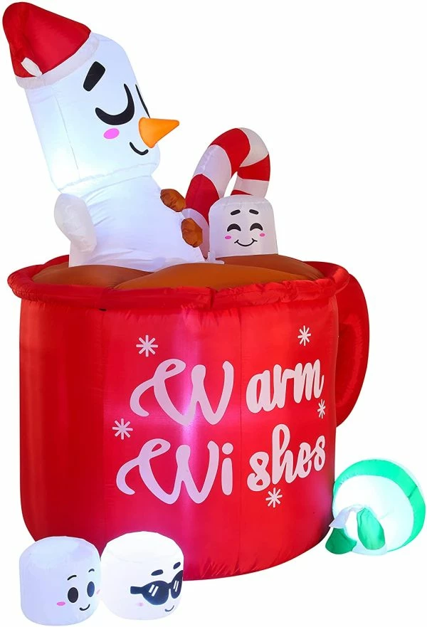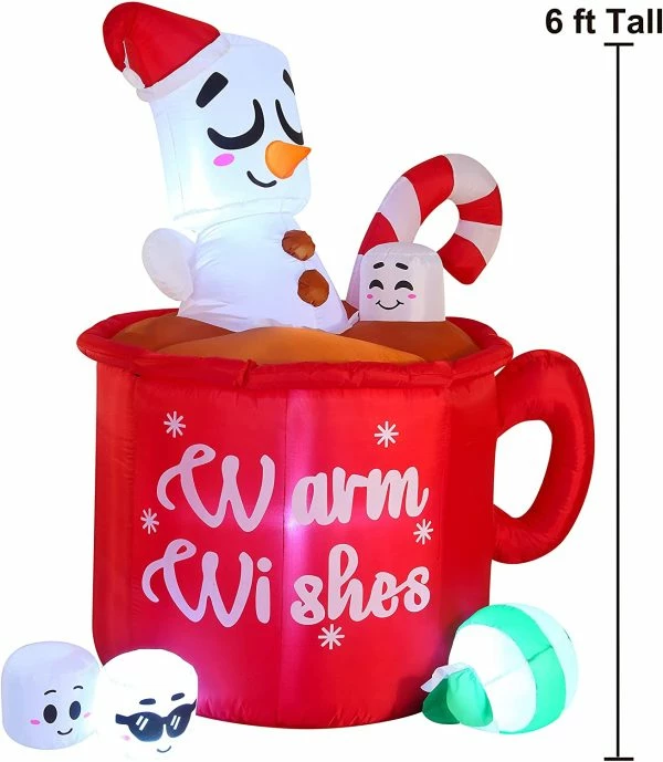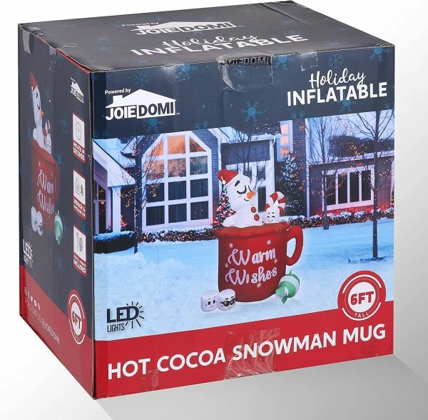 • Inflatable outdoor snowman 6 Feet Tall Inflatable Outdoor Snowman Mug comes with an extended cord, ground stakes, fastened ropes, built-in sandbags, and a plug with UL certification.