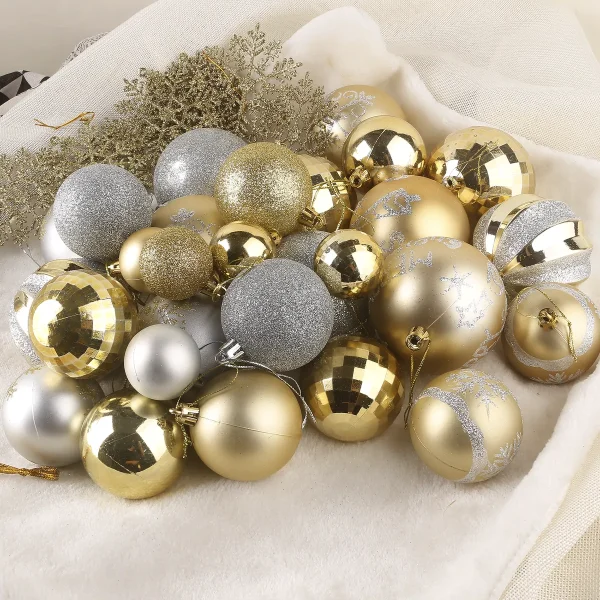 The elegant gold and silver Christmas style inspired the design of the Christmas tree ball ornaments. The classic gold creates a festive atmosphere, while the pure white accent creates an elegant and luxurious touch. These balls are made of shatterproof plastic that is both durable and eco-friendly. These shatterproof Christmas tree ornaments are made of unbreakable plastic. These ornaments are made from high-quality plastic that won’t crack or break when bumped into by little hands or feet. Perfect for families with children and pets. Elegant gold and silver theme products such as a tree skirt, stocking, tree topper, wreath, garland, and Christmas ornament set go well together. The hanging Christmas ball ornaments are beautiful, stylish, and eye-catching, and they complement a wide range of other holiday decorations.