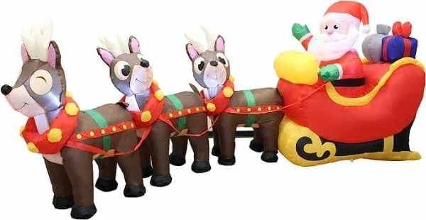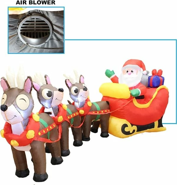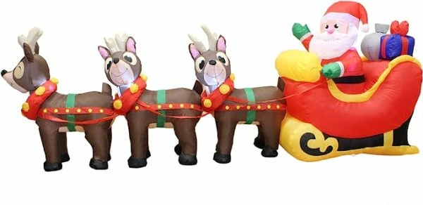 • This Christmas inflatable Santa with reindeer includes a 9.5 Foot Long Inflatable Santa Claus on Sleigh with Three Reindeer, 4 Fasten Ropes, 6 Ground Stakes, and a Plug with UL Certification.