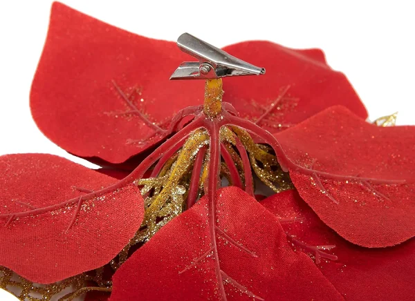 These gold glitter Christmas artificial poinsettias with pre-installed clips will add a festive touch to your holiday decor. Both the flower petals and the leaves of the poinsettia are glitter-filled, making it shimmer and stand out. Ideal for indoor and outdoor wreaths, garlands, trees, centerpieces, and adding a sparkle to your wrapped gifts. You can just put these on your wreath, and it will look great! These poinsettias will brighten up your Christmas tree! Keep your tree looking full and elegant with these Christmas poinsettia ornaments, perfect for filling in those larger bare spots on your tree, and you’ll get tons of compliments from family and friends.