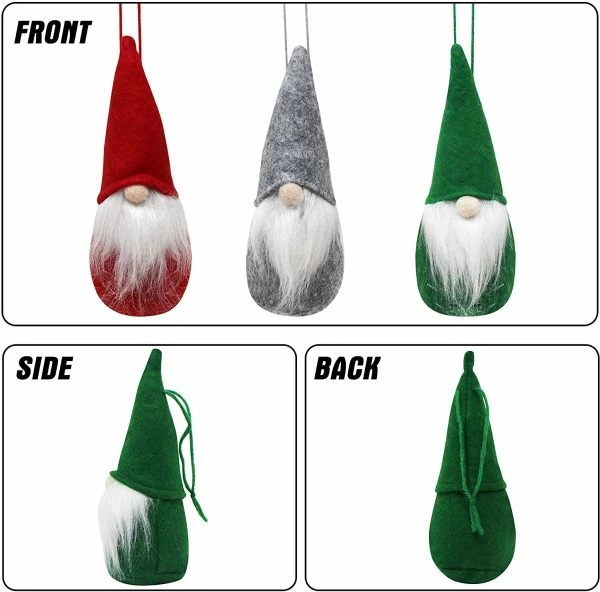 • Santa gnome plush includes 6 pieces of Gnome Plush Dolls Ornaments measuring 6 inches each in red, gray, and green.