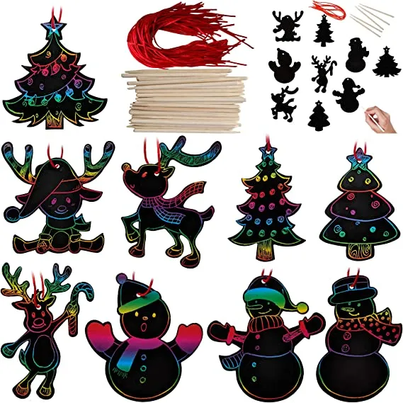 • Super valuable Christmas craft kits include 72 scratch paper(8 pcs for 9 patterns), 72 red cords, and 24 drawing sticks.