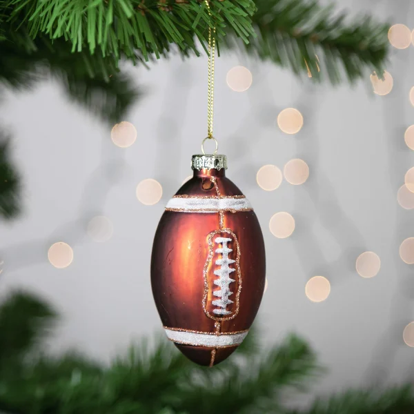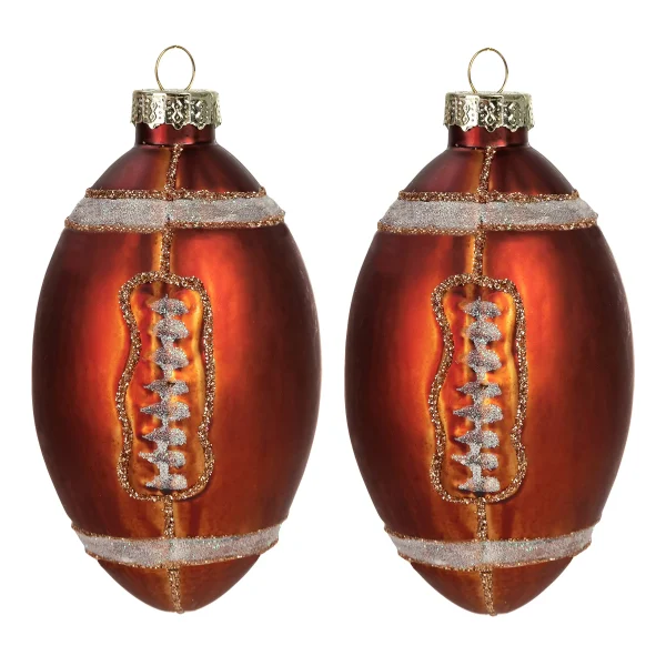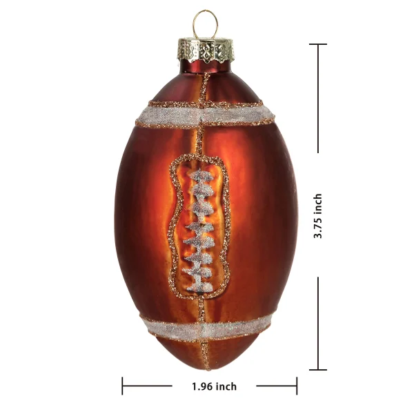 - Our glass Christmas tree ornaments set includes 2 pieces of football in hand-painted style. They are glass-blown ornaments based on the entity. The width is 1.96 inches and the length is 3.75 inches.