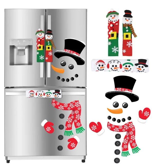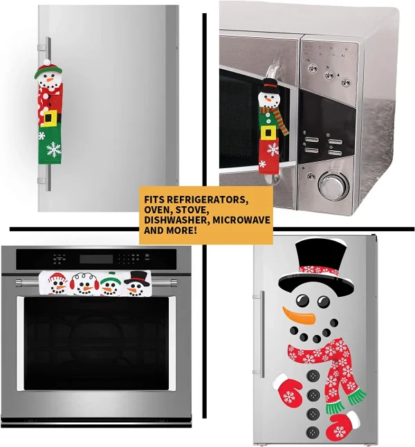 • Christmas kitchen decor includes 2 Vertical Fabric Snowman Handle Covers, 1 Horizontal Fabric Handle Cover with 4 Snowman Heads, and 16 pieces of Snowman Magnets. Measures 13.75″ long and 5.5″ wide for the Handle Covers.